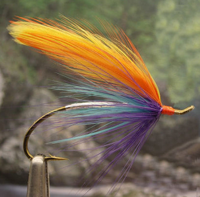 Wing: Two Orange Hackle Tips over Two Yellow Hackle Tips